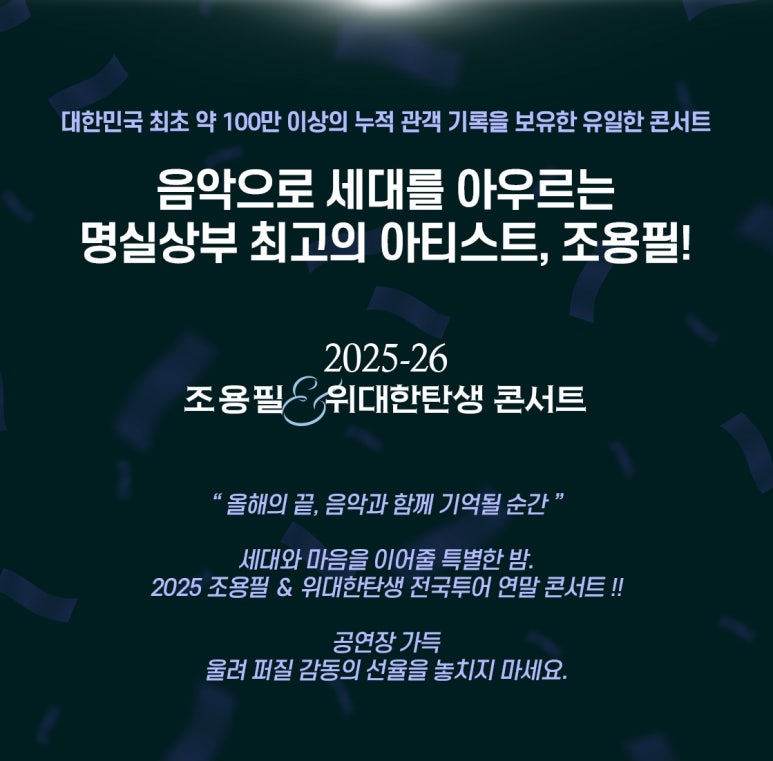 조용필의 2025-26년 전국투어 콘서트 티켓 예매가 시작됩니다! 한국 가요계의 살아있는 전설과 위대한탄생이 함께하는 특별한 무대를 놓치면 평생 후회할 수 있습니다. 지금 바로 예매 정보와 최고 좌석 확보 전략을 확인하세요.